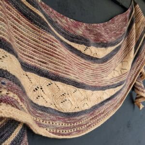 A fingering weight knitted shawl in three colours with touch of peekaboo lace.